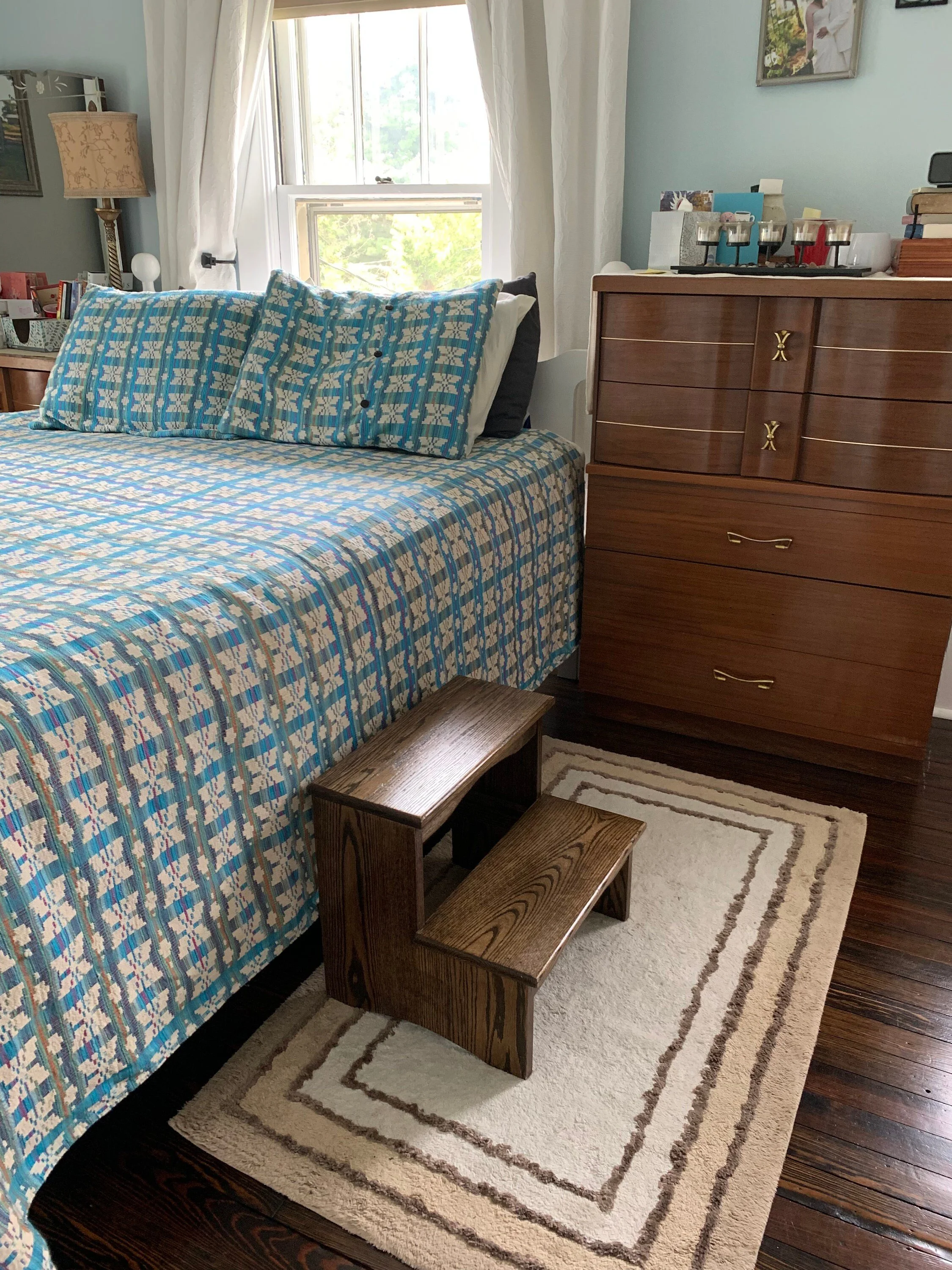 This handmade oak step stool is perfect for your kids who want to help in the kitchen, can’t reach the sink in the bathroom, want to get their own books off the bookshelf, or to help them get into bed on their own! Also works perfect for adults who need to reach the top cabinet shelf! Dimensions are 18” wide, 16” deep, and 16” tall.